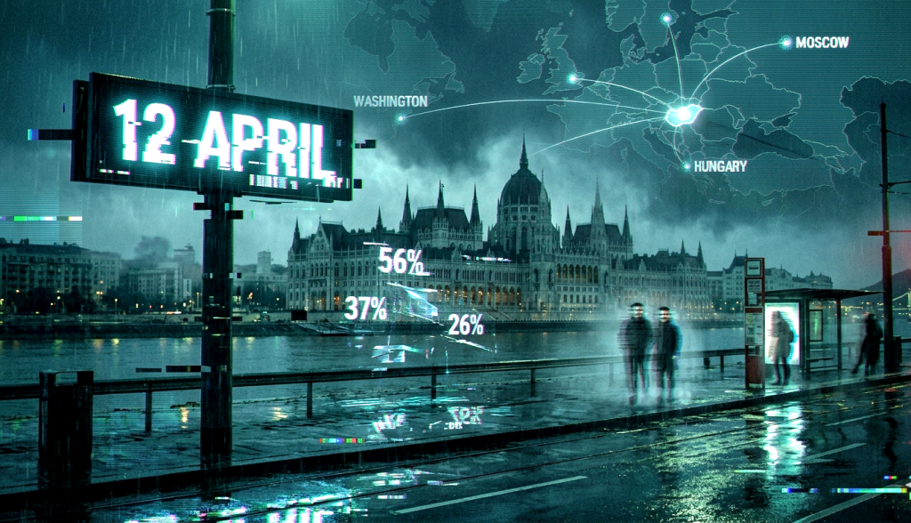 La date clignote comme un néon malade dans une ruelle humide de Budapest. Le réel se fissure par segments. Les chiffres arrivent en paquets disjoints, découpés, remontés — 56 %, 37 %, 26 % d’indécis — comme si quelqu’un bricolait la bande.