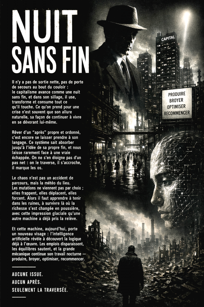2026. 20. avril Nuit sans fin, polar nécro Tweet Lien permanent Catégories : Crise et Mutation Tags : mutation, crise, nuit noire, caîtalisme, chaos 0 commentaire